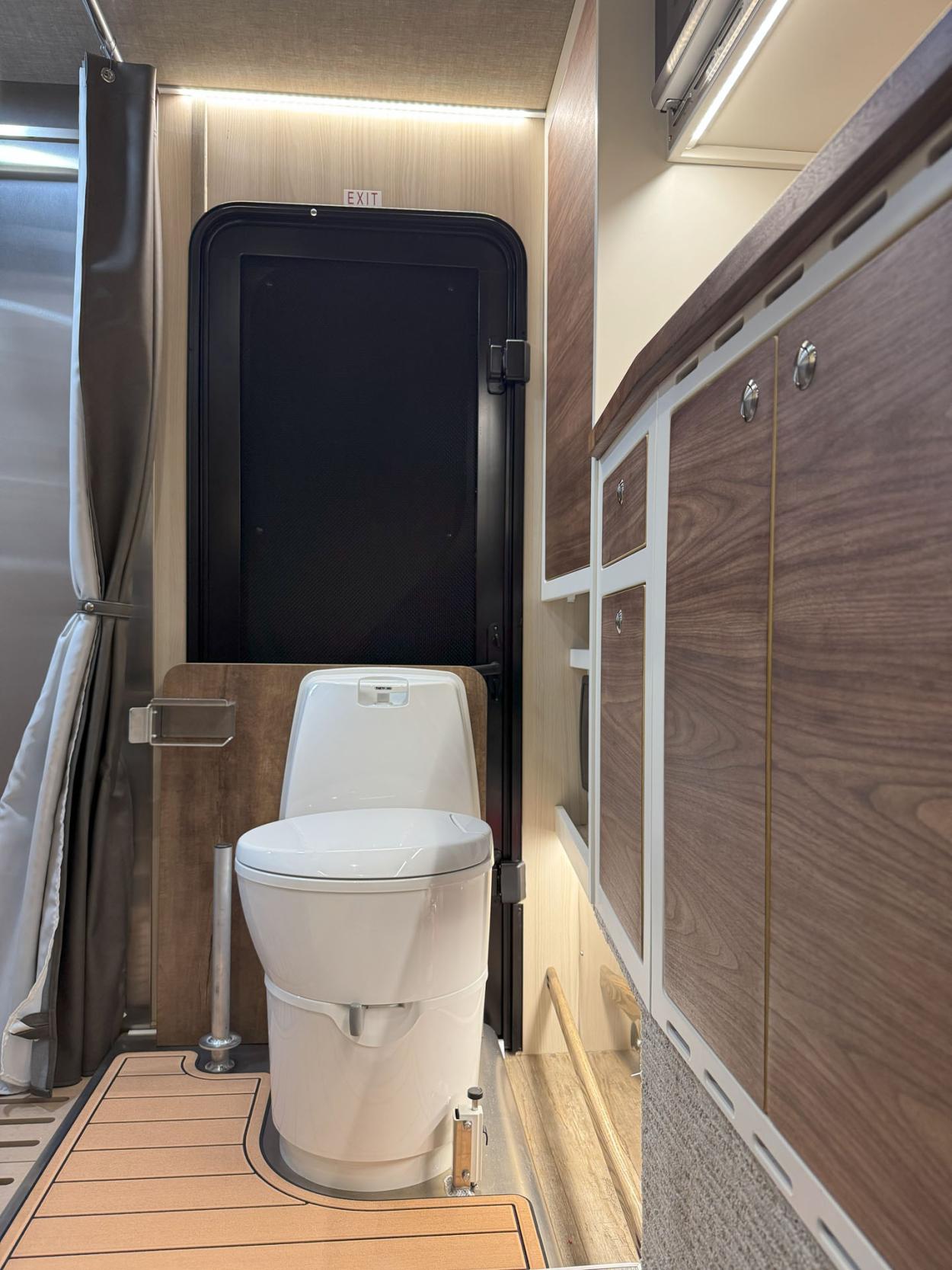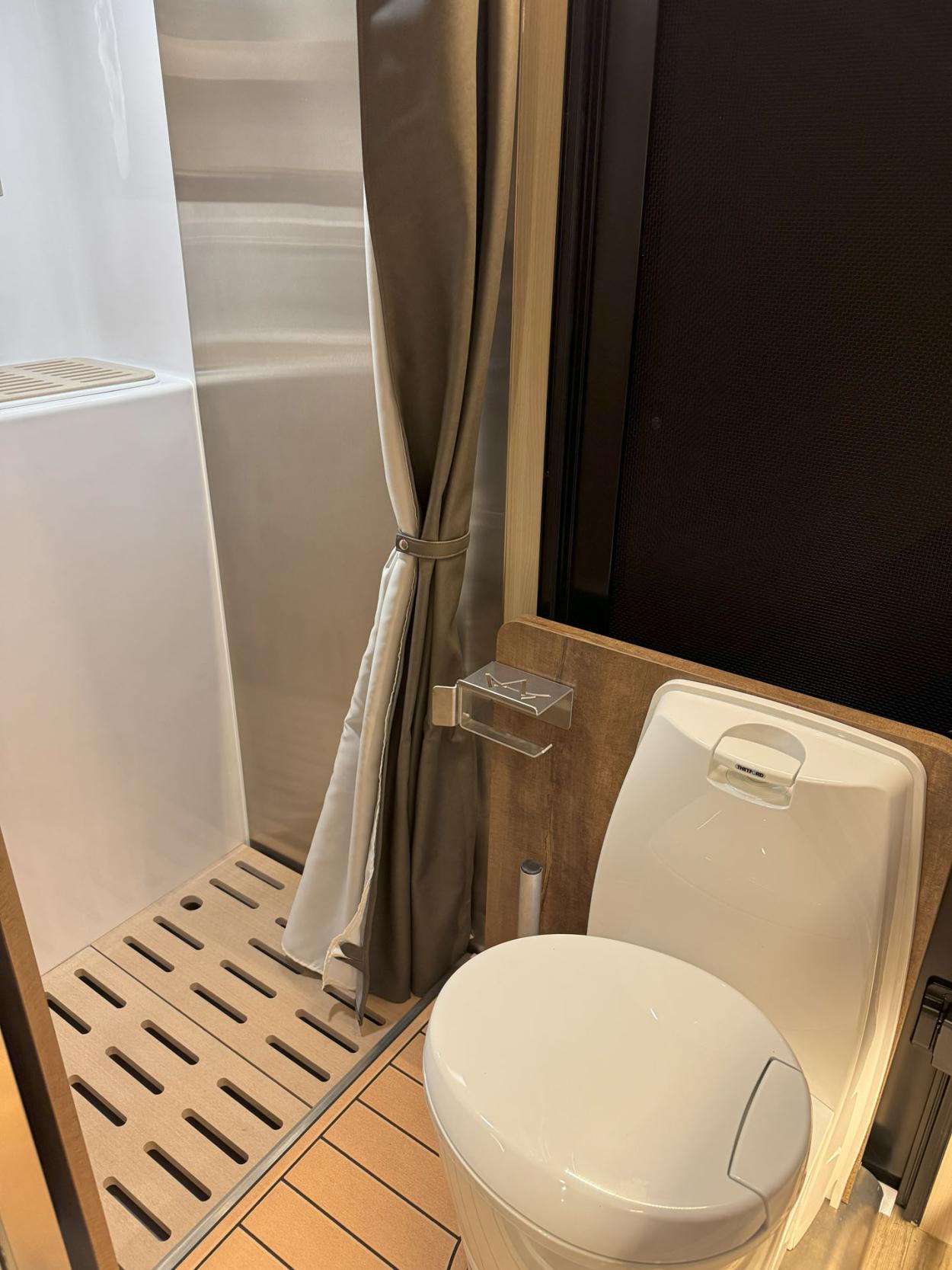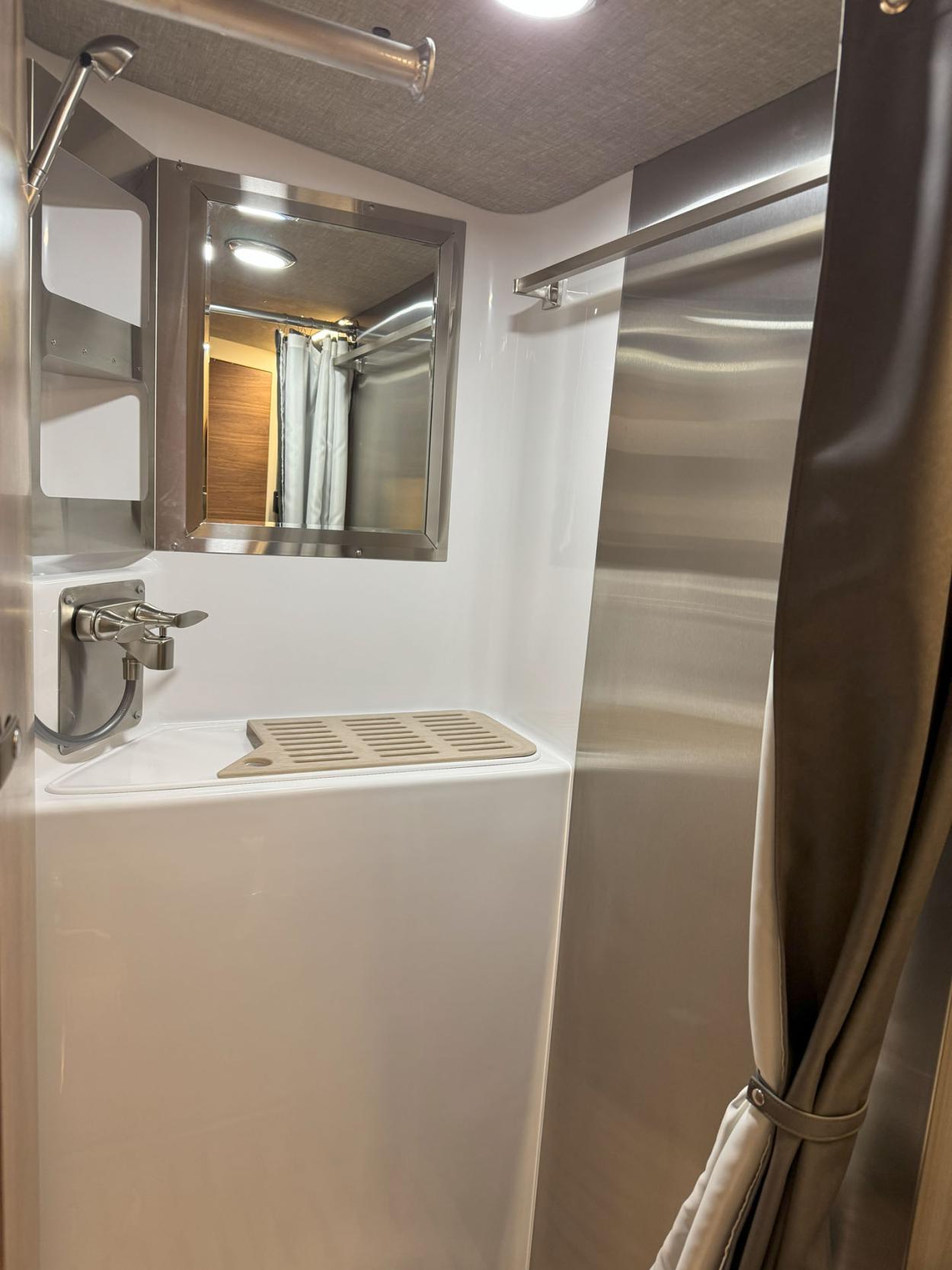 - 24 Gauge Stainless Steel, Dry Bath Shower with Molded Sink, Stainless Steel Vanity Mirror/Shampoo Holder, Privacy Door w/Full Length Mirror, Rotating Hanger Rod and Shower Curtain. Includes Sliding Thetford Cassette Toilet C224-CW Model View Photos - $2,690
