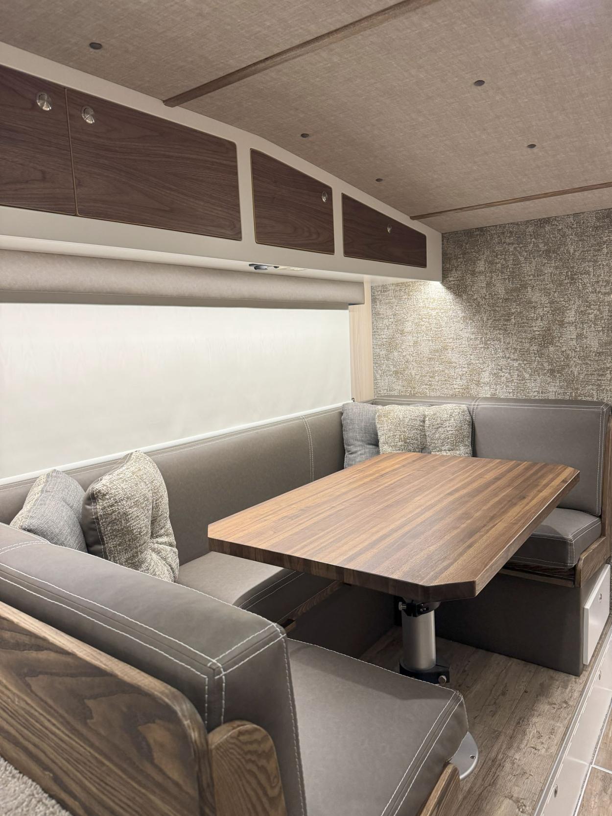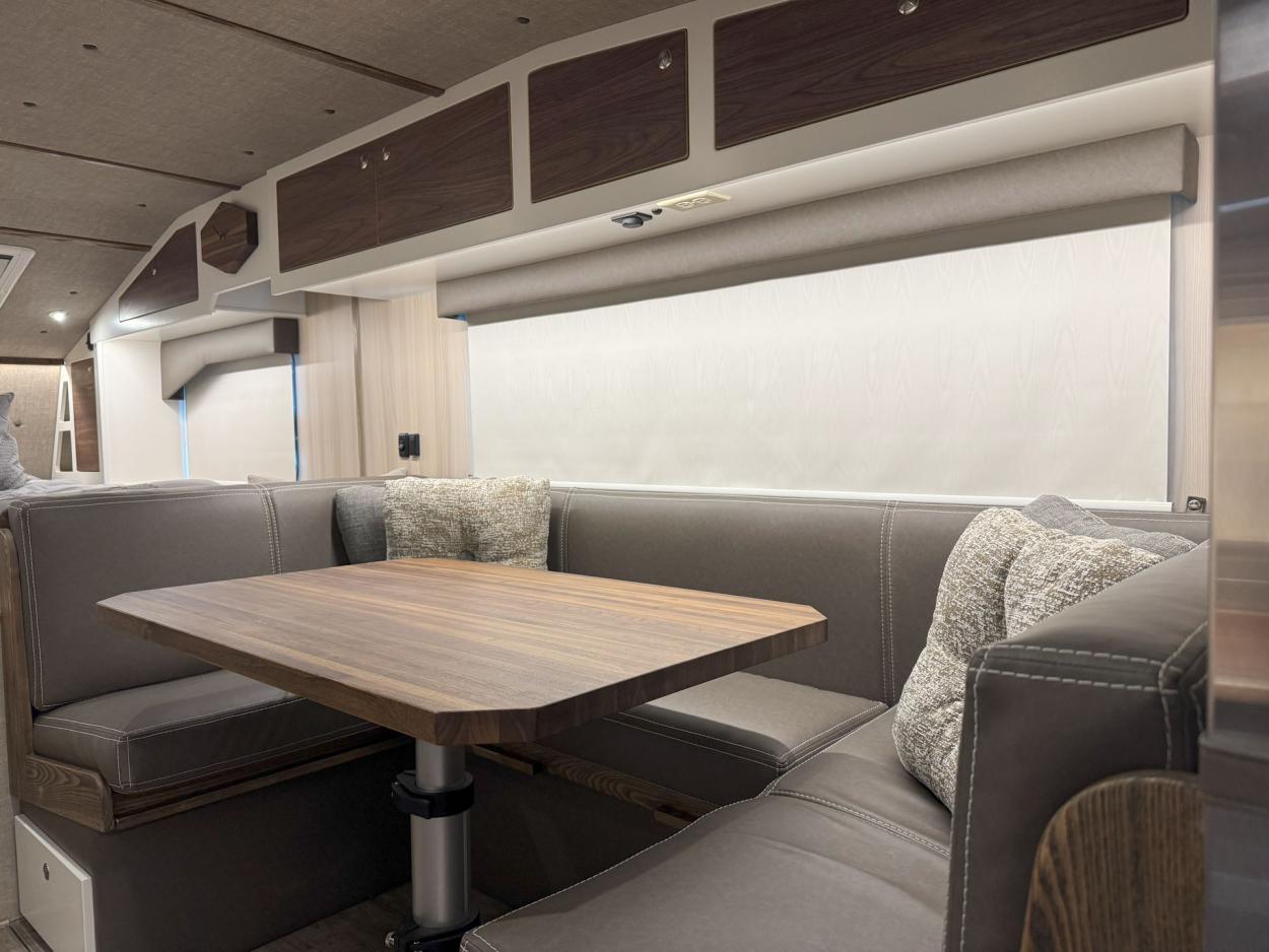Some things just aren’t the same without....and that’s true with the good ol’ dinette table that doubles as a sleeper bunk! There’s just something nice about a big U shaped dinette with table for two, to prep out that catch from the “river that runs thru” or inviting another couple in for a round or two. Simply, simplistic!