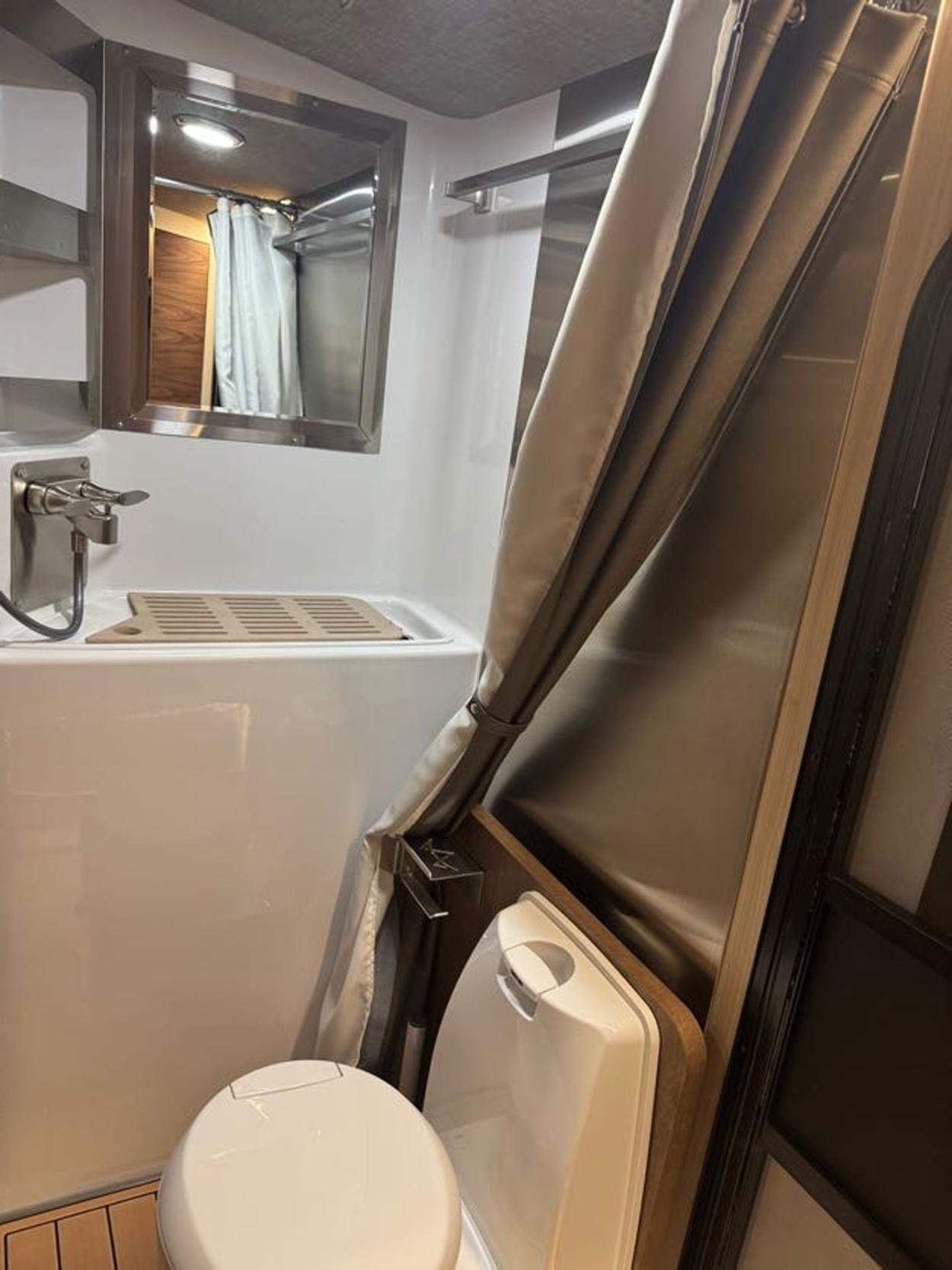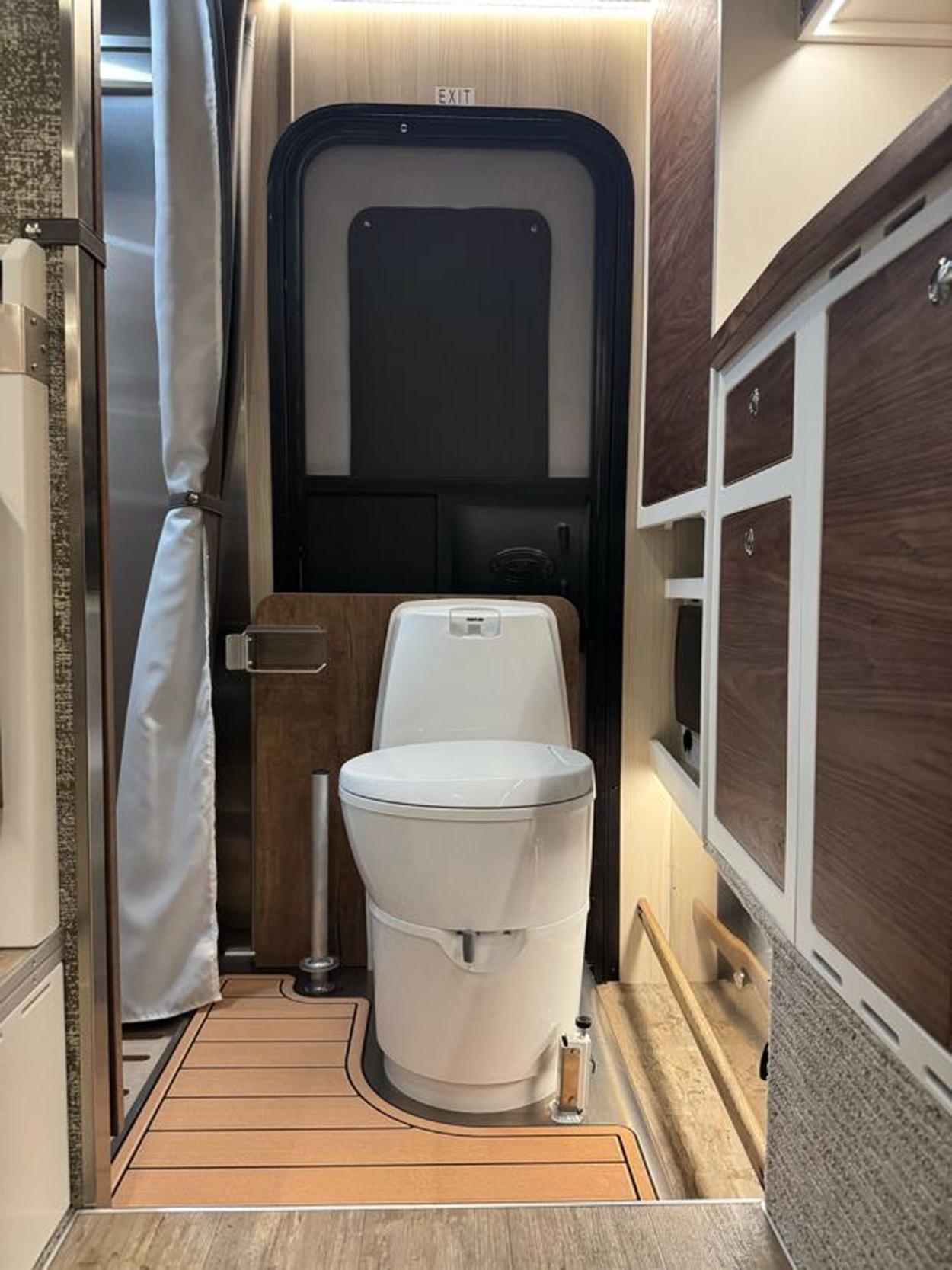 - 24 Gauge Stainless Steel, Dry Bath Shower with Molded Sink, Stainless Steel Vanity Mirror/Shampoo Holder, Privacy Door w/Full Length Mirror, Rotating Hanger Rod and Shower Curtain. Includes Sliding Thetford Cassette Toilet C224-CW Model View Photos - $2,690